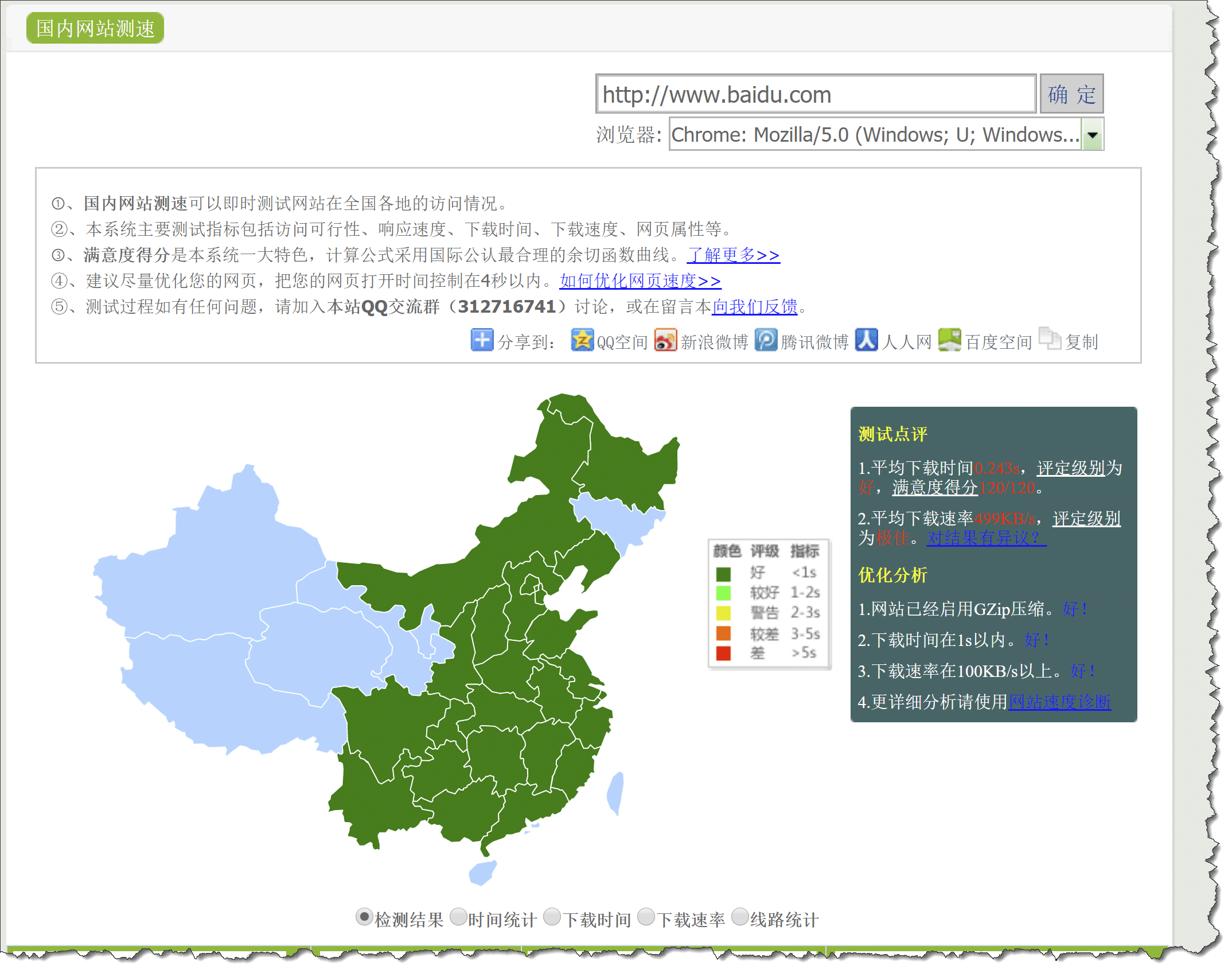 Webkaka is a Chinese website with a name that will generate a smile from NZ users, but it is our favorite tool because it provides the best test we've found of how a website really works in China and we routinely use the results it produces in presentation and demonstrations for clients. The trick for non-Chinese is to use the built in Google Chrome feature to translate the the site. Once you've translated the home page you will quickly find the page speed testing form where you can submit your URL. The results will load in a new page which you can translate as well. The map (as shown above) will give you a color coded view of how your site performs in different regions all around China.